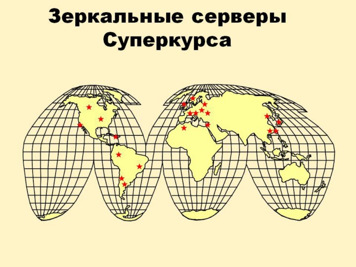 Копии целого курса расходятся очень быстро, с помощью более чем 55 зеркал по всему миру. Данные на февраль 2014 года. http://www.pitt.edu/~super1/mirror/index.htm . Мы обеспечиваем файлы для зеркал конечно же бесплатно. Их легко можно обновить. Зеркальные сервера очень важны, не только потому, что в некоторых случаях они ускоряют передачу изображений, а потому что являются началом или дополнением собственных программ по глобальному здоровью. Имея копию на своем компьютере, вы вообще не имеете проблем для просмотра и использования слайдов лекций. На сайте Ставропольской Медицинской Академии появилось зеркало проекта Суперкурса, и лекции Суперкурса теперь доступны прямо с домашней странички Академии - http://stgma.ru/