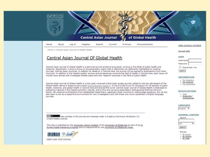 Служба поддержки призвана улучшить качество исследований и статей как от молодых ученых, так и от ученых, для которых английский язык не является родным. Часто именно языковые проблемы является причиной отказа в публикациях в ведущих научных журналах. На базе Суперкурса создан собственный журнал, который принимает статьи на английском языке в том числе и ученых из России и других стран СНГ. В этом году журнал пошлет заявку на получение импакт фактора. Присылайте свои статьи! http://cajgh.pitt.edu/ojs/index.php/cajgh Знакомьтесь с исследованиями ваших коллег из Казахстана и других стран, в том числе и из США. |