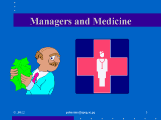 socialise. Doctors have a long training in a University environment, their clinical experience may be confined to a very small area.They have a particular medical jargon They are Specialists. Managers, after a first degree learn, through working in different areas of health care and are promoted on merit. Further qualifications come less from Universities and more from Institutes-Accounting,Administration etc. They are generalists. Managers work mainly a 9-5pm day-often much more………doctors are often on call at night and weekends and work long hours in theatre, clinic or ward. They are paid differently. Managers-salaries, bonuses, share options,performance related pay. Doctors-salaries, fees,retainers. Managers have less job security-they often take the blame and lose their job while to further their careers they often need to move on regularly after 2-3 years in a post. Doctors,once appointed in a career post, may stay in the same job for many years. They have considerable job security. Doctors who become Managers move into a very different world-Managers do not become Doctors! |