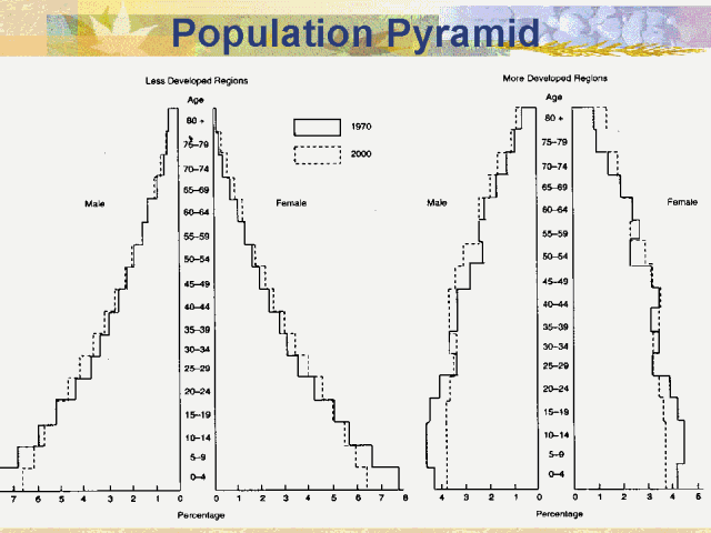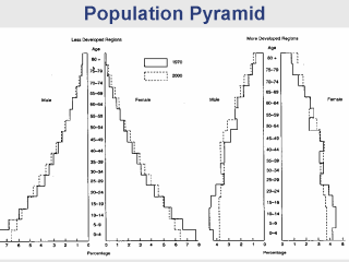 Figure 2-3 Sex-age structure of the population in less developed and more developed regions, 1970 and 2000. Source: Reprinted from The Population Debate: Dimensions and Perspectives by the United Nations, p. 195, © 1974.