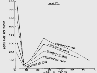 Age-specific death rates from tuberculosis (all forms) among males in successive ten-year birth cohorts, Massachusetts