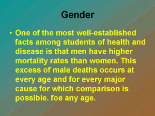 | Two proposed explanations for this gender difference ; biological explanation , stating that women are biologically more fit than men and social or life style explanation purporting that men behave in ways more damaging to health i.e. employment, hard driving behavior, cigarette smoking and physical activity. |