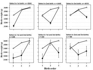figure shows crude mean birth weight (with 95% CI) by birth order for infants in families