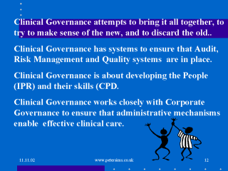 Governance is a partnership between Clinical Medicine and Management. The objective is to deliver better care, more of the time to the people in need-and to know how well ……..or badly, we are doing. |
