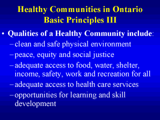 mutually supportive relationships and networks - workplaces that are supportive of individual and family well-being - wide participation of residents in decision-making - strong local cultural and spiritual heritage - diverse and vital economy - protection of the natural environment - responsible use of resources to ensure long term sustainability |