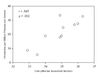 | Homicide rates in 10 Canadian provinces as a function of the Gini coefficient of income inequality (upper panel) and of median household income (lower panel). |