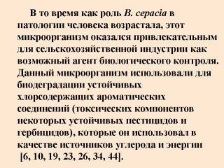 | В частности, важным токсическим компонентом, разлагавшимся B. cepacia, была 2,4,5-хлорофеноксиацетиловая кислота – потенциальный гербицид, который не нашёл применения, т.к. плохо разлагался и накапливался в окружающей среде [44]. |