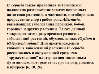 | В лесной промышленности, которая несла большие потери от патогенных грибов, таких как Fusarium, Phytum, Rhizoctonia, Cylindrocarpum, Botrytis, был разработан штамм B. cepacia, обладавший высокой антагонистической активностью и предназначавшийся для рассеивания и инокуляции в корневую систему [43]. Нелишне напомнить, что подобный штамм должен обладать чрезвычайной устойчивостью к различным антибиотикам – продуктам жизнедеятельности грибов. |