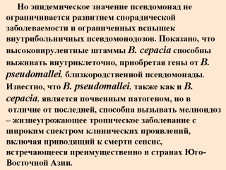 | Передача генетического материала от возбудителя мелиоидоза с образованием гибридных штаммов в природных условиях высоко вероятна, поскольку недавние исследования выявили вставку генетических последовательностей B. pseudomallei у B. cepacia, включая высковирулентную трансатлантическую эпидемическую линию [31, 47]. |