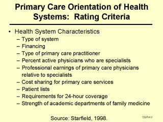 of primary care practice itself. Health policy characteristics concerned to the extent to which there are efforts to distribute health services resources equitably in the population, the aegis and universality of financing for primary care, whether the modal primary care practitioner was a family physician, the balance between the number of primary care physicians and specialists as well as the amount of their professional remuneration, the absence of cost sharing for primary care services, requirements for the maintenance of patient rosters or lists, the extent of requirements for 24-hour coverage, and the strength of academic departments of family medicine. Each country was given a score of 0, 1, or 2 depending on how strongly the characteristic was developed. Source: Starfield B. Primary Care: Balancing Health Needs, Services, and Technology. New York: Oxford University Press, 1998. |