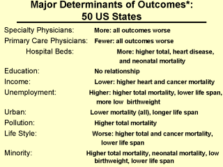 | Note: All variables are ecologic, not individual *Overall mortality; mortality from heart disease, mortality from cancer, neonatal mortality, life span, low birthweight. One of the first studies done in the 50 US states showed that the number of primary care physicians per population was the only characteristic consistently related to better outcomes, including overall mortality rates, mortality rates form heart disease and cancer, neonatal mortality, life span, and low birthweight. Other factors were related to higher rates of some of these indicators, and the number of specialty physicians per population was related to poor outcomes of all of these types. Source: Shi L. Primary care, specialty care, and life chances. Int J Health Serv 1994; 24(3):431-458. |