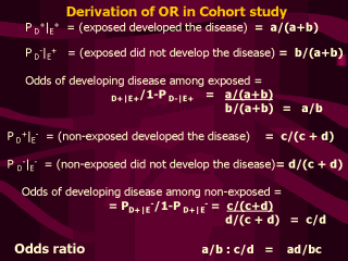 | In cohort study odds ratio is defined as the ratio of the odds of developing disease in exposed persons to the odds of development disease in non-exposed persons. |