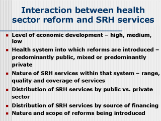 RHM held a meeting earlier this year to look at the implication of HSRs for SRH services and created a framework for this which includes the following factors: (ABOVE)