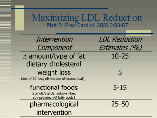| Several nutritional/lifestyle interventions successfully contribute to reductions in LDL-c and work in concert with drugs, often allowing a reduction in dose, if not discontinuation altogether of cholesterol-lowering meds in some patients. |