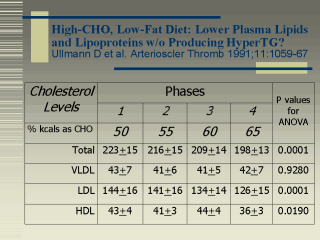 | This table showed that the level of total cholesterol was significantly decreased as the composition of CHO increased. This decrease was mainly attributed to the decrease in LDL. The level of VLDL remained unchanged and the level of HDL was also decreased when the level of CHO reached 65%. |