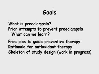 | I'm going to need to tell you a little bit about preeclampsia, as well as a little bit about previous approaches to prevent preeclampsia. The summation is that they haven't been successful, but there may be something we can learn from that. I'll talk about some principles to guide any form of preventive therapy, the rationale for antioxidant therapy, and then I'll give you the skeleton the NICHD/NHLBI study design, which will be beginning in January 2003. |