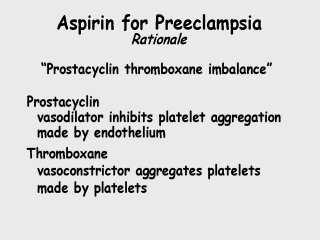 | So the other approach that went on almost simultaneously with the calcium trials was trials with aspirin. This was based on a hypothesis that preeclampsia, was caused by an imbalance of prostocyclin (vasodilator) and thromboxane (vasoconstrictor). The idea was that something happened in preeclampsia where you made less prostacyclin or thromboxane. |