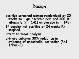 | They took high risk women and they gave them ascorbic acid and Vitamin E. Their numbers weren’t big enough to prevent preeclampsia. The idea was if I prevent oxidative stress, will I prevent endothelial activation? They had a marker, PAI-1 over PAI-2 which is made by the placenta. |