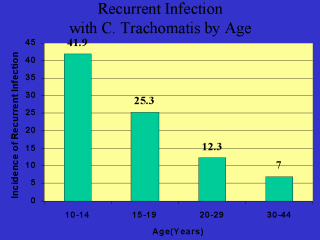 Gynecol. 1994;170:891 We also know that women who have had a single episode of Chlamydia, just like women who had a single episode of PID, are much more likely to get recurrent infections. These are recurrent infection groups within one year for various age groups, and you see that re-infection rates are astronomically high, particularly in young women. |