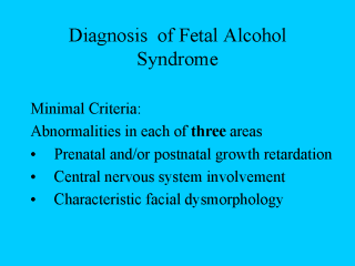 | Fetal alcohol syndrome as a diagnosis requires that the child or the adult have abnormalities in three different areas. |