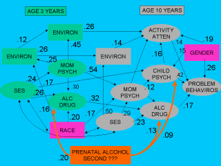| We were interested in the delinquency and substance use of the kids. As you can see, prenatal alcohol exposure is not directly related to problematic behaviors when you can see the other factors. |