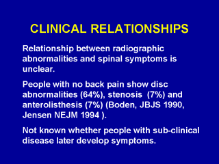 One of the interesting things when you are looking at unstable back pain is that there is almost no relationship between symptoms and what you can see radiographically or with MRI or with CT scanning. This is very disturbing. This just quotes some of the works that has been done on this. As you can see anterolisthesis 7% in healthy individuals. A lot of the things that we found in these SOF ladies is that anterolisthesis had absolutely no relationship to back pain. The ladies that had the slippage did not complain of back pain even more than other people, they were not functionally disabled or functionally impaired to any greater extent.
